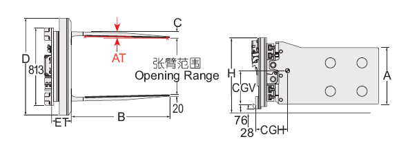 | Capacity 承載能力(kg) | Catalog Order NO 型號(hào) | Mounting Class 安裝等級(jí) | Opening Range張臂范圍(mm) | Arm Height臂高A(mm) | Arm Length臂長(zhǎng)B(mm) | Arm Thickness臂厚C(mm) | Overall Height總高H(mm) | Frame Width 框架寬度D(mm) | Arm Toe in內(nèi)扣量AT(見注5)(mm) | Weight 自重(kg) | Effective 失載距ET(mm) | Horizontal Center of Gravity 水平重心CGH(mm) |