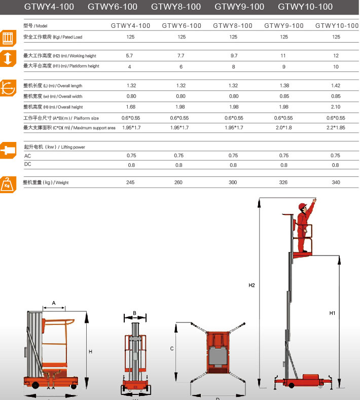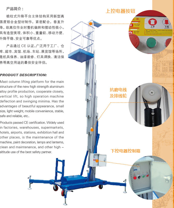 桅柱式升降平臺主體結(jié)構采用新型高強度鋁合金型材制作,緊密配合,垂直升降,故高位作業(yè)時整機偏轉(zhuǎn)和擺性極小。具有造型美觀、體積小、重量輕、移動方便、升降平穩(wěn)、安全可靠等優(yōu)點。